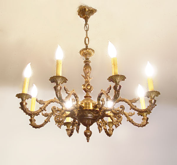 BRASS CHANDELIER: Ready for your decorative mini shades. 8 lights, Approx. 28''dia, 20''h.