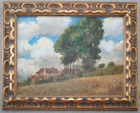BATES, Roy Elliott, (American, 20th C.): Cottage Landscape, OIL/Wood, 10 1/2'' x 14'', signed, contemporary carved and gilded frame, 15'' x 17 1/2''. Condition - Needs cleaning. Est. $500/800**