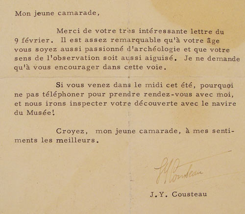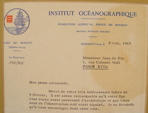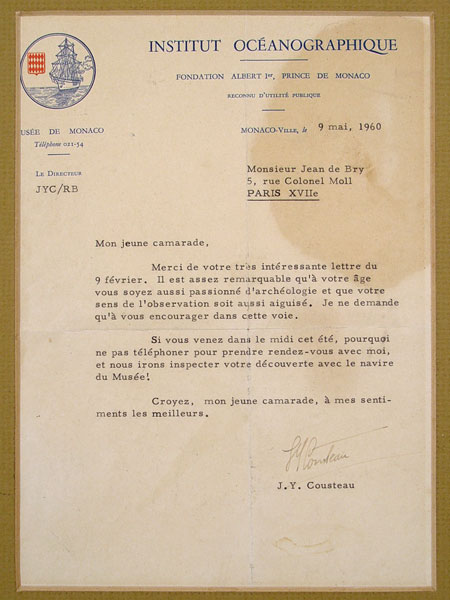 JACQUES COUSTEAU ALS SIGNED LETTER 1960: Dated May 9, 1960, on Institut Oceanographique letterhead to Monsieur Jean De Bry. Letter references Cousteau wanting to meet De Bry and setting up to take the Museums ship to inspect his discovery. Note foxing, large stain upper corner, fold line, letter has been glued to backboard. Matted measures 13'' x 10 1/2''.