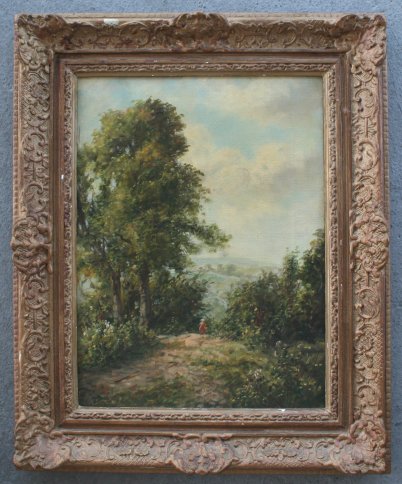 BRITTON, James, (American, 1878-1936): Figure in a Landscape, OIL/C, 16'' x 12'', signed, gilded, carved and painted gesso frame, 21 1/2'' x 17 1/2''. Condition - Minor stretcher bar wear. Est. $400/600**