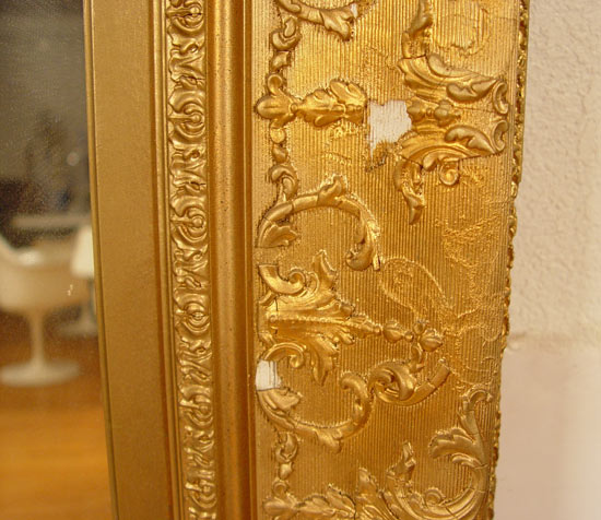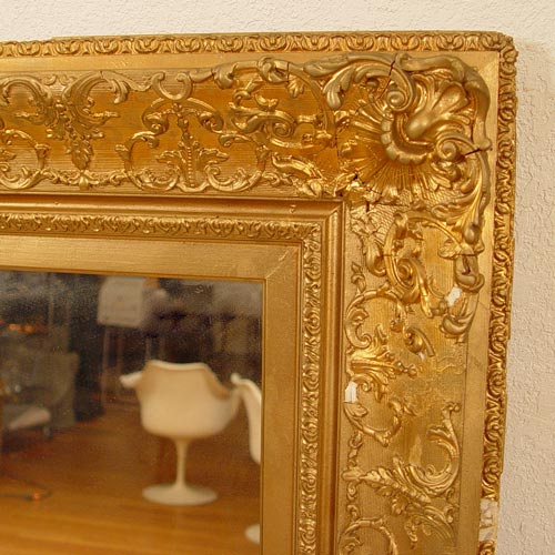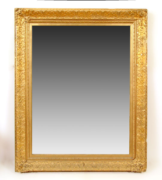LARGE GILT WOOD FRAME WALL MIRROR: Frame measures 62'' high x 50'' wide. Note repair one corner, loss of trim and gilt.