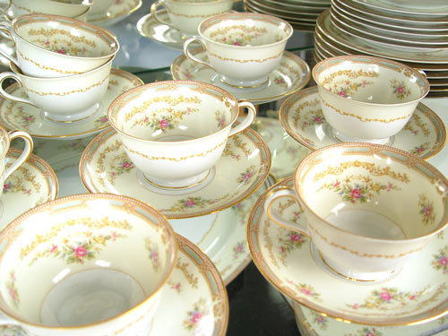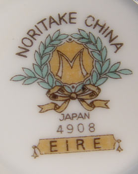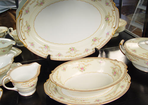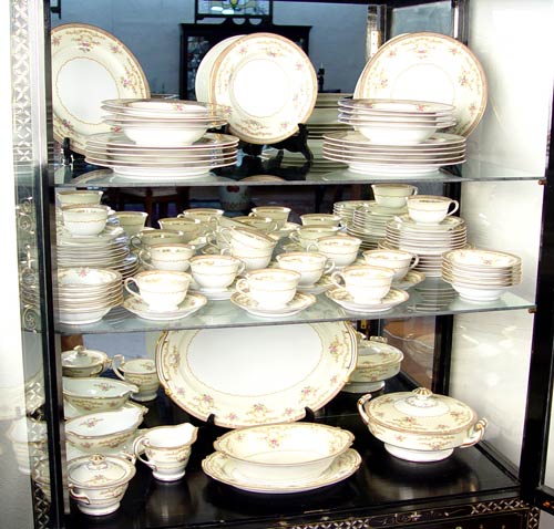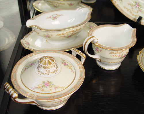 NORITAKE FINE CHINA IN THE ''EIRE'' PATTERN: 87 piece service to include 12 dinner plates, 12 salad plates, 12 bread plates, 9 soup bowls, 12 dessert bowls, 12 cups, 11 saucers, creamer, open sugar, gravy, covered serving bowl, open oval serving bowl, a 12'' platter and a 16'' platter.