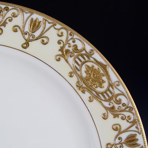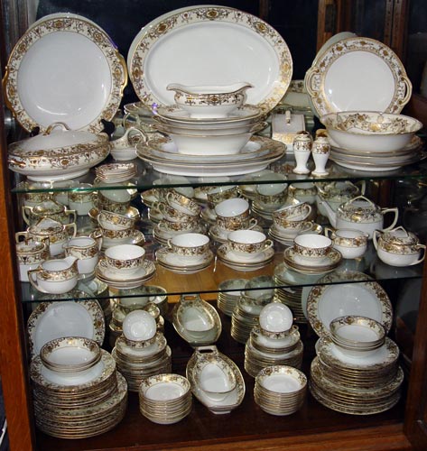 ORNATE GOLD RIM NORITAKE CHINA 16034: 148 pieces to include 15 dinner plates, 16 salad plates, 12 bread plates, 18 dessert bowls, 13 cups, 31 saucers, 2 bouillon cups, 3 covered sugars, 3 creamers, teapot, salt & pepper shakers, 5 salt dips, celery tray, covered butter, relish dish, 5 handled cake plates, round open serving bowl, 2 open oval bowls, candy dish, candy basket, and 4 platters. Please note there is some wear to the gold.