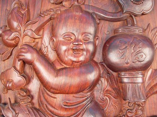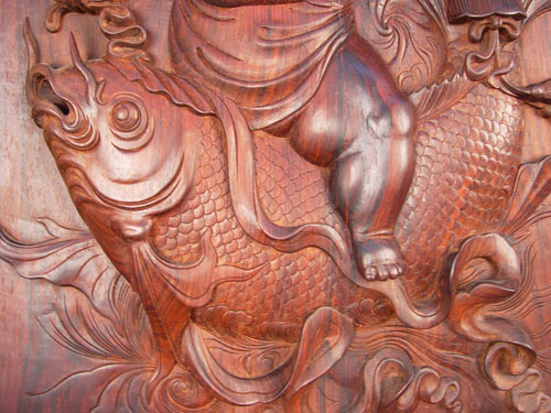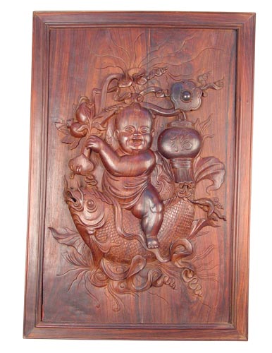CARVED WALL PLAQUE BUDDHA WITH FISH: Relief carved with image of young Buddha riding koi or Chinese carp. Note split, separation from one side. Measures 35'' high x 23 1/2''