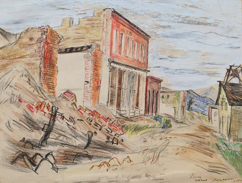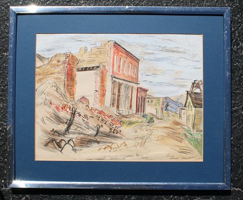 MITCHELL, Bruce, (American, 1908-1963): ''Nevadaville, CO.'', Colored Pencil/Gouache, sight size 12 1/4'' x 16 1/2'', signed, chrome frame with no glass, 18'' x 22'', dedicated to Reeves Lewenthal, founder of Association of American Artist (AAA).
