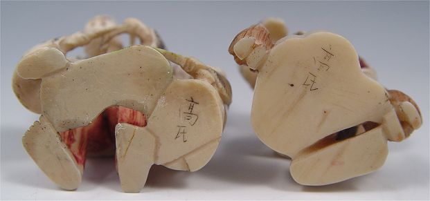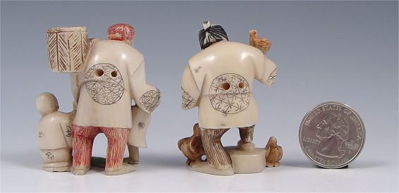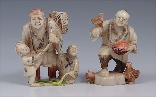 2 JAPANESE IVORY NETSUKE: To include 1) Man with basket feeding birds, hand tinted, signed on base. 2 1/8'' high. 2) Man with basket and 2 children, hand tinted, signed on base in characters. Measures 2 1/8'' high.