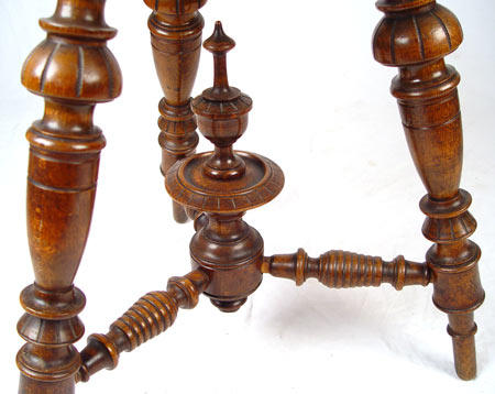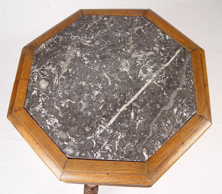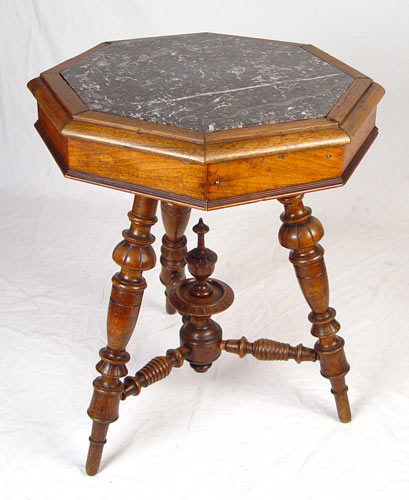 LATER 19TH C OCTAGONAL THREE LEGGED WALNUT TABLE: Recessed marble top, splayed legs with center finial. Measures 28 1/2'' high x 24 1/2'' dia.