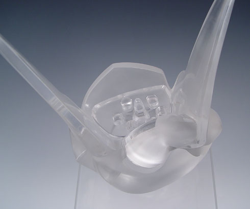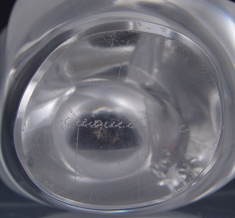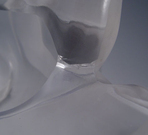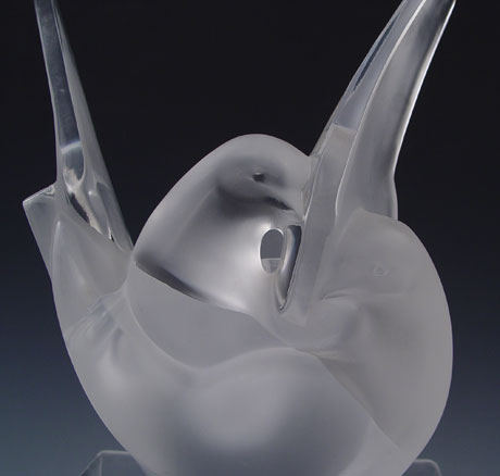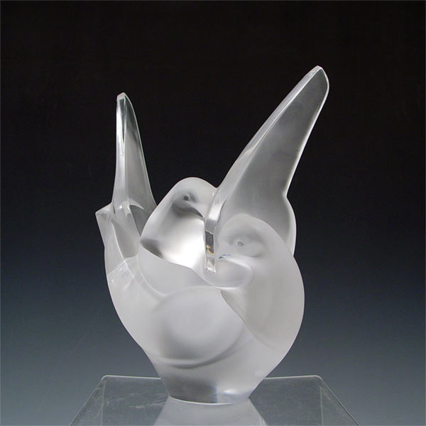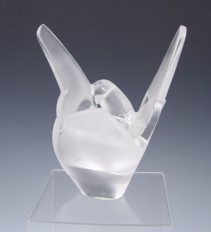LALIQUE SYLVIE GLASS DOVE FLOWER VASE: Form of 2 doves with frosted bodies gradient to clear wings. 6 hole flower frog insert. Signed Lalique France. Note scratches on base. Measures 8'' high x 7 1/2'' x 4''.