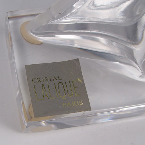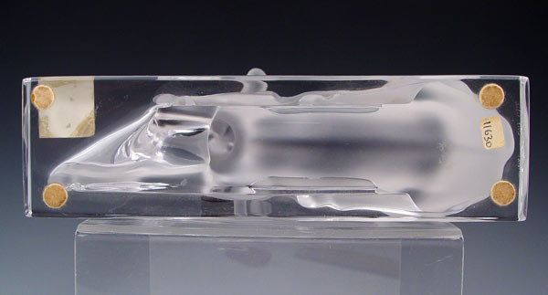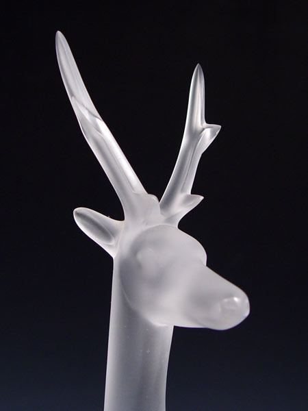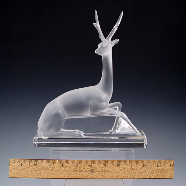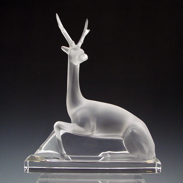 FRENCH LALIQUE LYING DEER FIGURE: Frosted stag body with clear base. Signed Lalique France with original label. Measures 10'' high x 8 3/8'' x 2 3/8''.