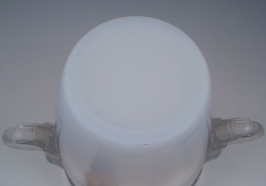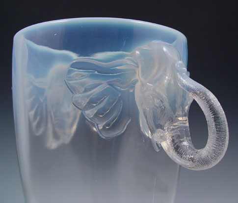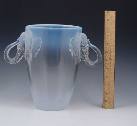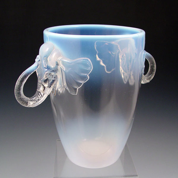 PEARLESCENT GLASS ELEPHANT VASE: In the manner of Sabino or Fry. Elephant head side handles. 10''h, 12'' overall dia.