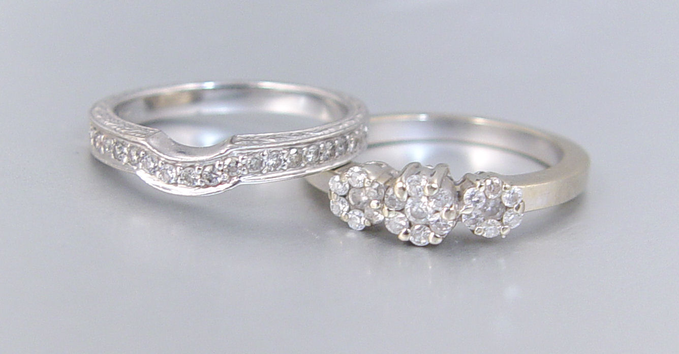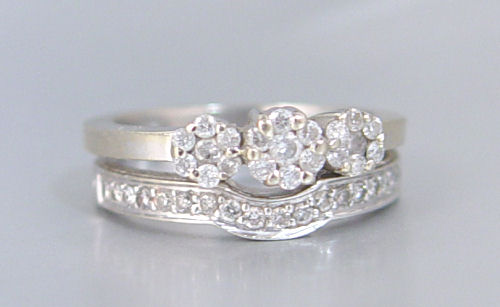 A SWEET 14K AND .70 CTW DIAMOND BRIDAL SET: 14K white gold bridal set contains 40 round full cut diamonds set in a flower design. Weight: .70 Ct. Approx. The diamonds average I1 in clarity and I-J in color. The diamonds are prong and bead set. Weight: 7.2 grams. Size: 6.5