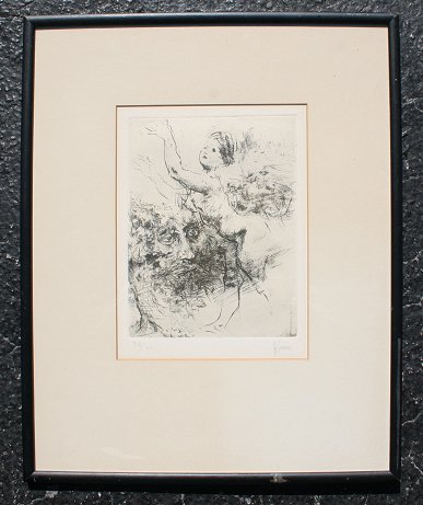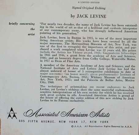 LEVINE, Jack, (American,1915- ): Nude, Etching, sight size 11'' x 8 1/4'', pencil signed, numbered 82/100, AAA label verso, black frame with minor wear, 20 1/2 x 16 3/4''. Condition - Faint mat staining in the margins.