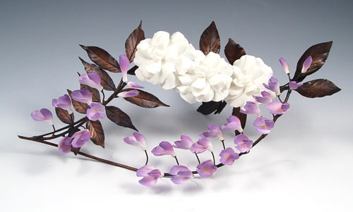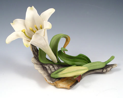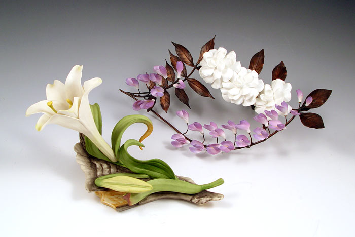 2 BOEHM PORCELAIN FLOWERS: 1) Lily, 103, 6 3/4''h. x 10'', U.S.A. 2) Gardenia & Wisteria, porcelain on metal base, 60017, Made in England.