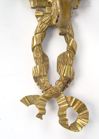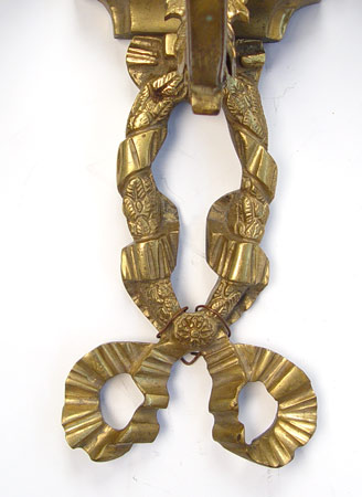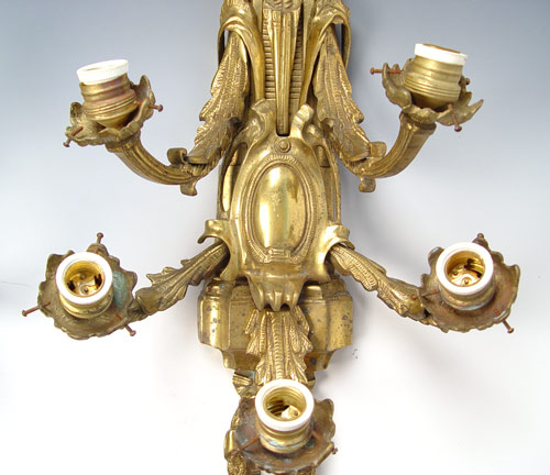 PAIR OF FRENCH STYLE ORNATE BRASS LIGHT SCONCES: Five light wall lamps, over 3 ft long. Measures 39'' high x 13'' wide x 8'' deep. Please note loss of ribbon section on one.