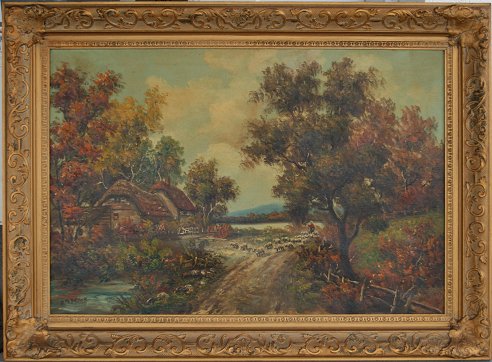 ENGLISH COTTAGE PAINTING SIGNED B.M. BROWN: OIL/Canvas, 24'' x 36'', carved and gilded gesso frame, 32'' x 44''. Condition - Needs cleaning. Est. $400/600**