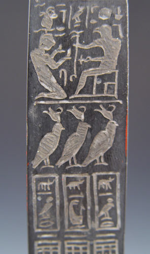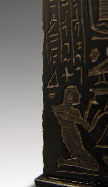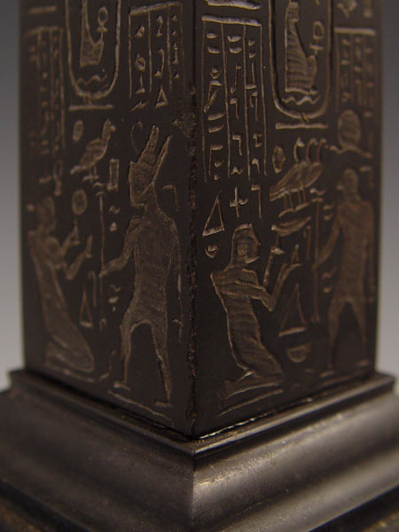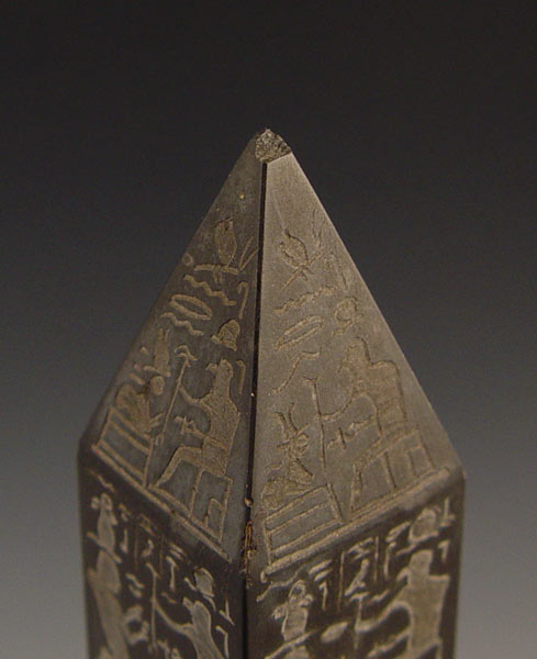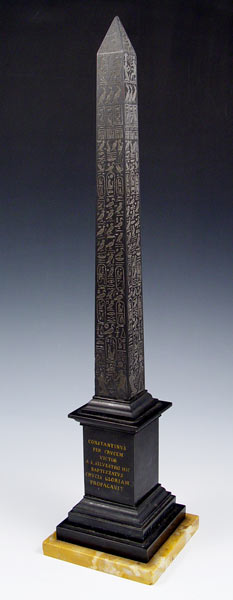 VICTORIAN GRAND TOUR CARVED STONE OBELISK: Mid 19th century, on stepped base with incised hieroglyphics on each side. Latin inscription on base. Note chip at tip, minor chips on corner near base.. Measures 16 1/2'' high x 3 7/8'' square base.