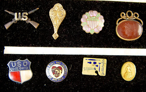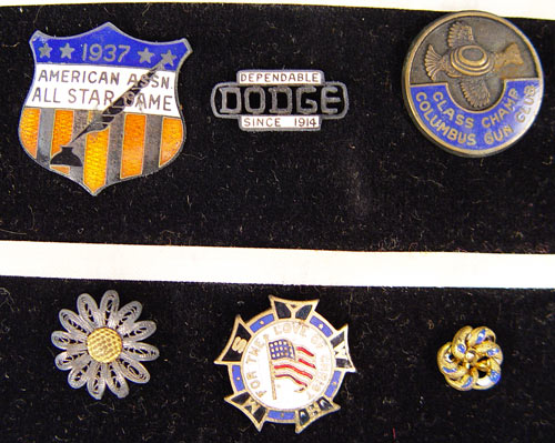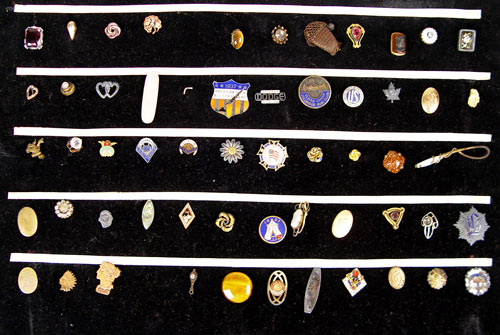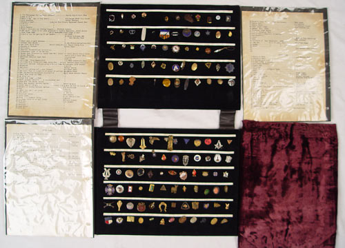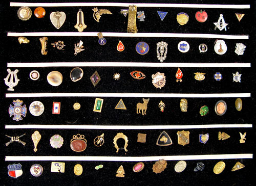 127 PIECE COLLECTION OF FRATERNAL TIE PINS: Approx 127 pins to includes Masonic, Odd Fellows, Knights of Columbus, 1937 American Association All Star Game, Shriners, real photo, spider, and many other associations. 3 have diamonds. Comes with partial inventory including where the pin was acquired. Set is mounted in presentation case, measures 1 1/4'' high x 13 1/4'' x 10 1/4''.
