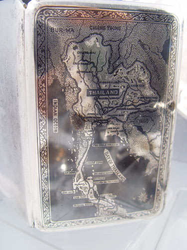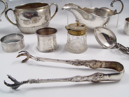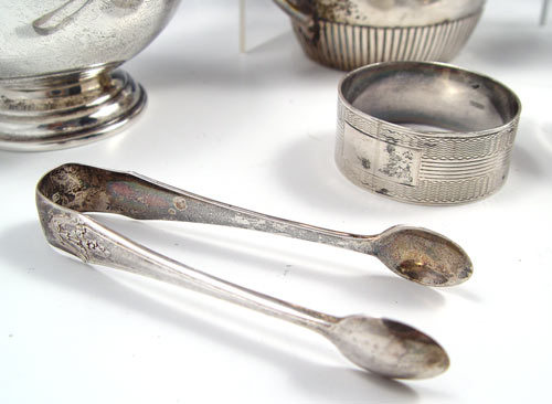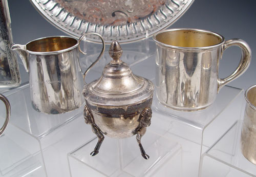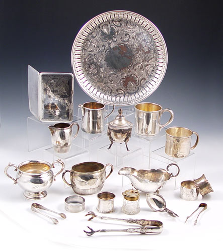 ESTATE ENGLISH & AMERICAN STERLING COLLECTION: 14 assorted pieces to includes cups, creamers, sugar bowl, J.E. Caldwell ice tongs with chicken feet, cigarette case with map of Thailand front, sugar tongs, napkin rings, coasters. Most monogrammed, note condition. Approx 26.6 troy oz. sterling. Also includes 800 silver German sugar and napkin ring, approx 3.7 troy oz 800 silver. Also included is 4 silverplate pieces, pierced tray, footed salt, dragon spoon and glass salt. From the Estate of G. Elisabeth King, granddaughter of Count Valerio Magawly-Cerati-de-Calry and daughter of Christopher James Patrick Bannon of Castle County Offally Kilcormac, Ireland.