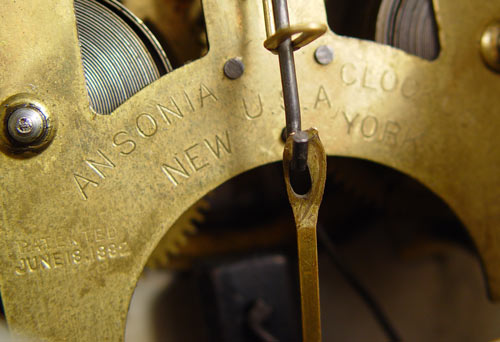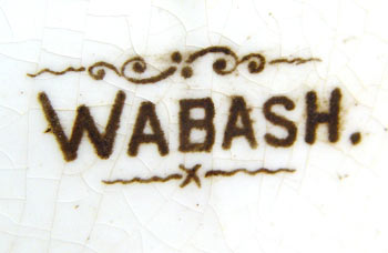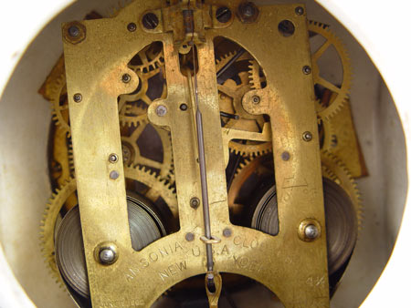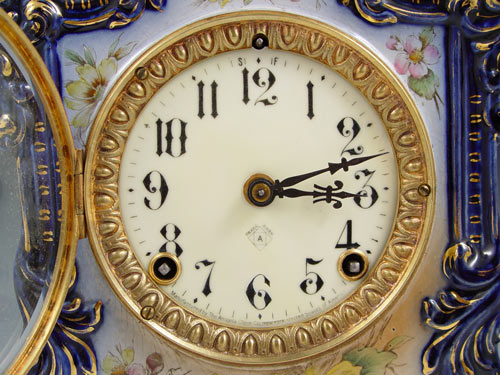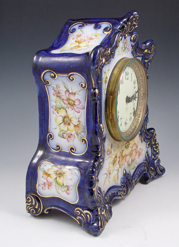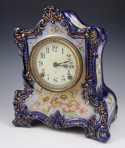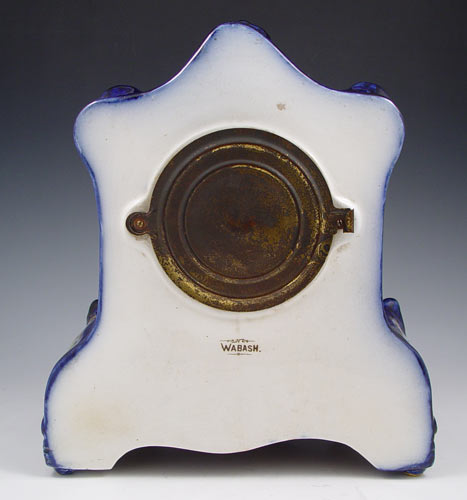 ANSONIA BLUE ''WABASH'' PORCELAIN CASE CLOCK: Porcelain case with deep blues, floral decoration and gold accents, note slight crazing, some gold loss. Case marked on back ''Wabash''. Porcelain face marked with typical Ansonia marks. No chips or cracks. Key and pendulum movement. Beveled glass crystal. Measures 12'' high x 10 1/4'' x 5 1/2''. Key and pendulum in office.