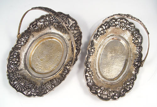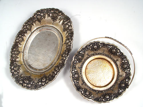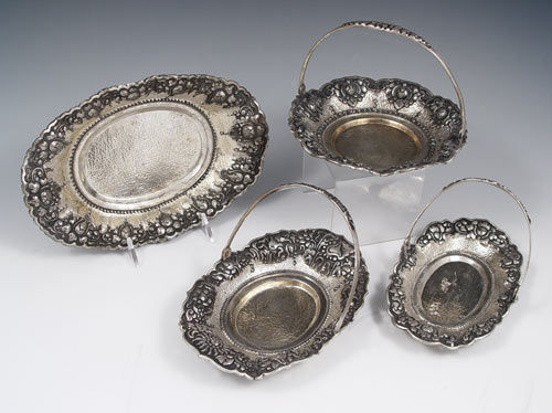 4 REPOUSSE CONTINENTAL SILVER TRAYS: To include 3 smaller trays with articulated handles and larger tray with no handle. All are hand hammered with floral repousse rims. Marked 800. Largest tray measures 1'' high x 8 1/8'' x 5 1/2''. Approx 14.8 troy oz.