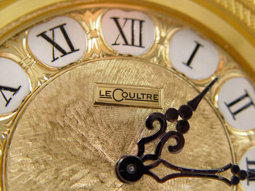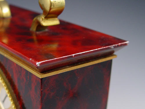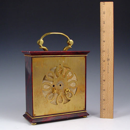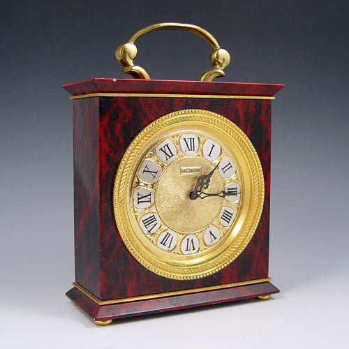 LECOULTRE 5570 SHELF / MANTLE CLOCK: Unique carriage clock style faux marble metal case with mixed metal face. Roman numerals on dial. Note loss of finish to brass handle, back, chips to paint on metal. Marked LeCoultre on face and 5570 on back. Missing one key crank, not in working condition.