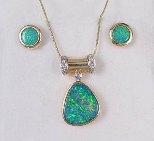14K OPAL & DIAMOND NECKLACE & EARRINGS: 14K yellow gold necklace and earrings contain two 2 6.00 mm round opal doublets and 1 freeform 15.00 x 12.00 mm opal doublet. Blue/Green play-of-color. 7 round full cut diamonds. Weight: .06 Ct. Approx. Rated I1 in clarity and H-I in color. 14K yellow gold 1.00 mm snake chain. 18'' in length. Weight 7.6 grams.