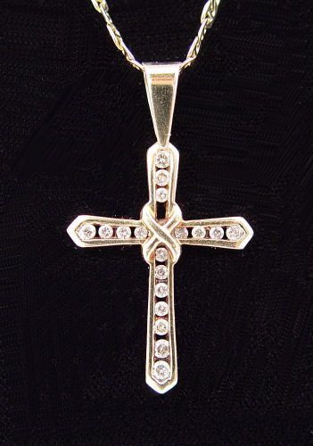 14K DIAMOND CROSS NECKLACE: 14K yellow gold 24'' link chain with lobster claw clasp with a 10K yellow gold cross pendant containing 18 round full cut diamonds. Weight: .40 Ct. Approx. The diamonds average I1 in clarity and Light Brown in color. The diamonds are channel set. 14K bail. Weight: 8.8 grams.