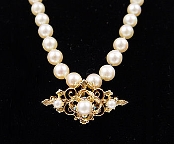 CULTURED PEARL STRAND NECKLACE AND BROOCH: 16'' strand of 6.50-7.00 mm cultured pearls, blemished, dark cream, medium luster with a 14K filigree clasp. 14K yellow gold brooch contains three 3.50 - 6.00 mm cultured pearls, slightly blemished, light cream, medium-low luster. Bar pin closure with pendant hook on reverse. Weight: 5.5 grams.