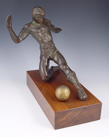 ROSSI, Remo, (Swiss, 1909-1982): Soccer Player figural sculpture, Patinated Metal, 9''h. x 15''l. x approx. 10''w. (hand to hand), signed, affixed to wooden plinth, 16''l. x 5''w., overall approx. 11 1/2''h.