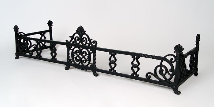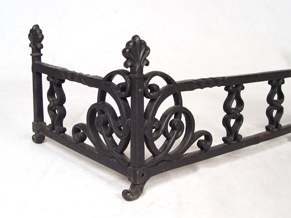 BLACK IRON FIREPLACE FENDER: Scroll designs. Measures 11'' high x 48 1/2'' wide x 13 1/4'' deep.