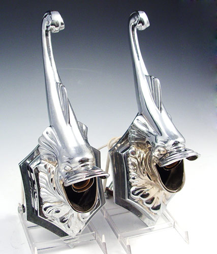 ART DECO CHROME DOLPHIN FORM WALL SCONCE LAMPS: New Metal Crafts of Chicago label. Single bulb incandescent fixtures, 11'' x 4 1/4''.