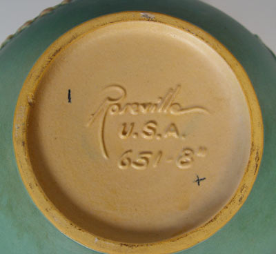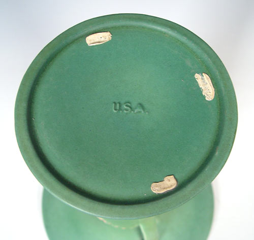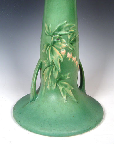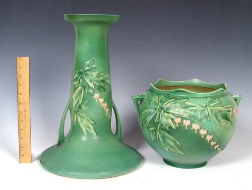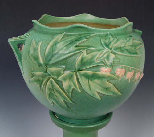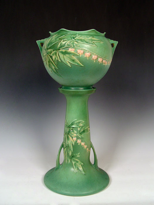 GREEN ROSEVILLE BLEEDING HEART JARDINERE & PEDESTAL: 651-8'' jardinere, 13'' dia.. Matching pedestal measures 16 3/4'' high x 11 3/4'' base dia.