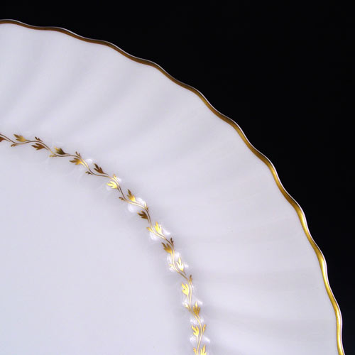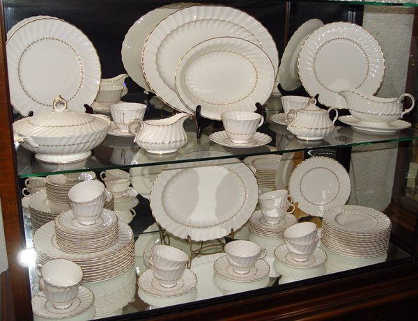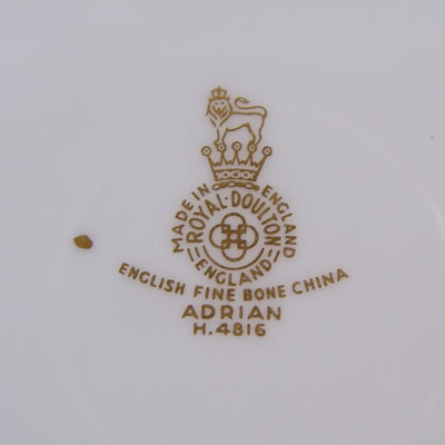 ROYAL DOULTON FINE CHINA IN THE ADRIAN PATTERN: 70 piece service for 12 to include 12 each of dinner plates, salad plates, and bread plates, 14 cups, 14 saucers, gravy boat, cream pitcher, covered sugar, oval vegetable and 2 platters.