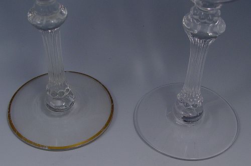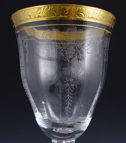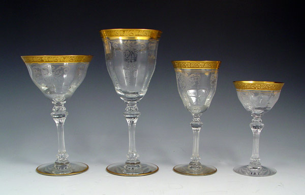 FINE GOLD RIMMED ETCHED CRYSTAL STEMWARE: 29 piece suite to include 8 water goblets (8''), 6 tall sherbert champagnes (6.5''), 7 wines (6 2/8''), and 8 cocktails (4 1/4'').