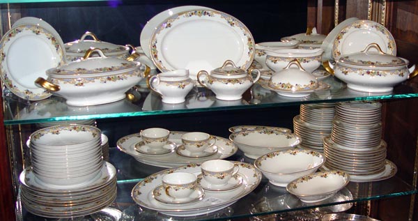 BAYREUTH CHINA SERVICE: 66 pieces to include 2 platters (16 and 12''), relish dish, covered butter, gravy, creamer, sugar, round covered vegetable, oval covered vegetable, 10 dinner plates, 12 salad plates, 10 bread plates, 11 soup bowls, 2 cups, and 12 saucers.