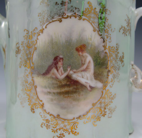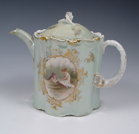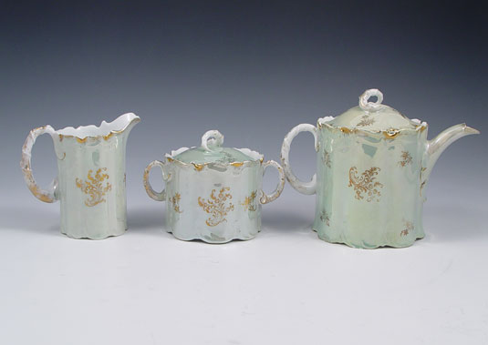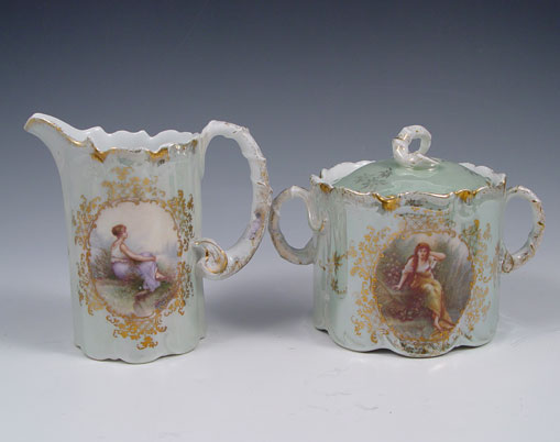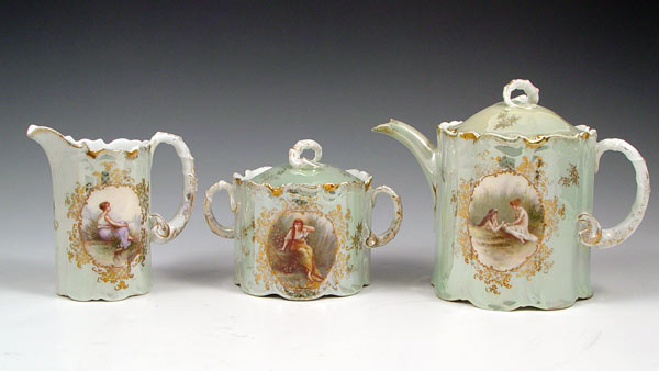 ROSENTHAL MONBIJOU TEAPOT, CREAMER AND SUGAR: Luster finish with Art Nouveau images of maidens. Pot is 6''h.