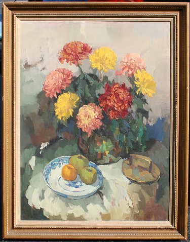 VAN DER HURK, Jan, (Dutch, 20th C): Still Life with fruit and flowers, OIL/Canvas, 40'' x 30'', signed and dated 69, pencil signed verso, original painted frame with minor wear, 47'' x 36''.