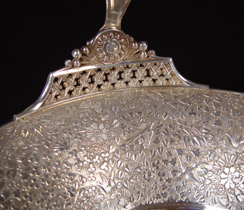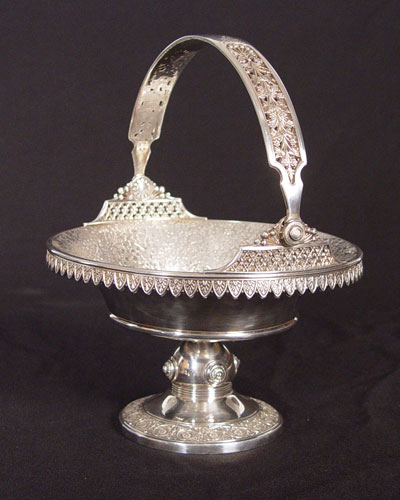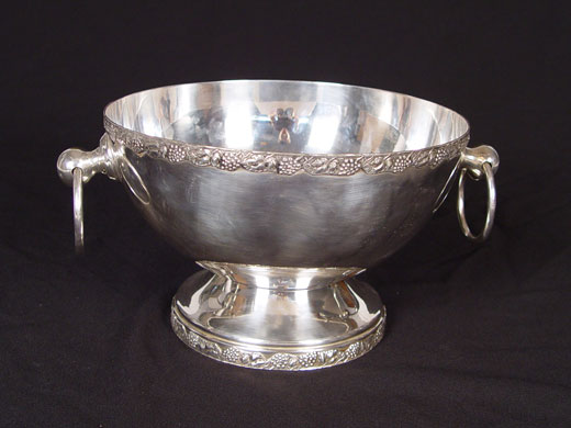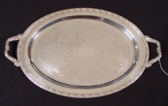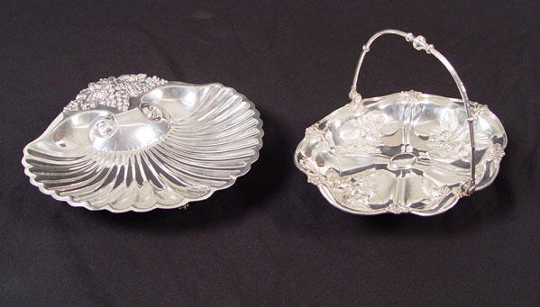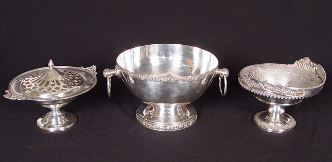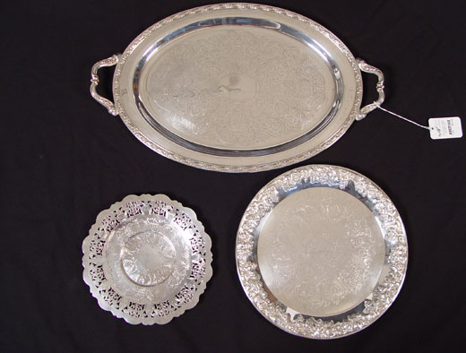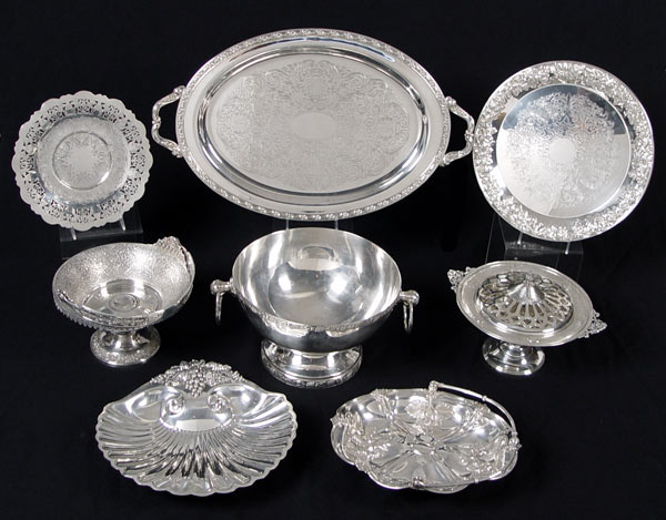 ESTATE COLLECTION OF SILVERPLATE SERVING PIECES: 8 pieces to include 1) Middletown with floral and bird design, 7 1/2'' high x 9 1/2'' dia. 2) Large punchbowl, grape vine rim, 7 3/4'' high x 15'' wide overall. 3) Engraved and openwork tray, 10 1/4'' dia. 4) Repousse tray with fruit design and articulated handle, 3 1/2'' high x 12 1/4'' x 9 1/2''. 5) Meriden compote with engraved and medallion design. Measures 8'' high x 12 1/4'' wide overall. 6) Wallace shell form footed tray with grape design. 3'' high x 12'' x 12 3/4''. 7) Sheridan serving tray with engraved design and repousse grape vine 1'' high x 13 3/4'' dia. 8) Onieda 2 handled serving tray with engraved design, 1 1/2'' x 24'' x 14 1/2''.