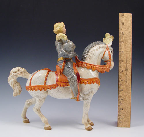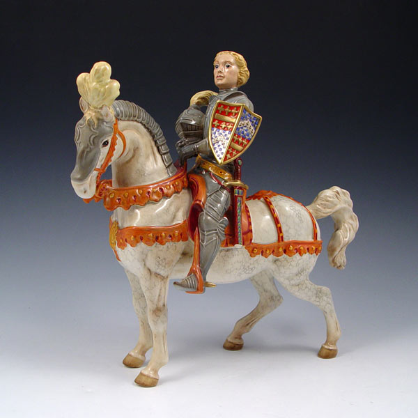 BESWICK EARL OF WARWICK KNIGHT IN ARMOR: A rare Beswick figure designed by Arthur Gredington, issued 1949-1973. 10 3/4'' h. x 11'' long. Please note unfortunate loss of sword tip.