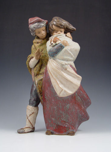 LLADRO FIGURE 1279 THE WIND ''CARA AL VIENTE'': 13 3/4'' tall, two children with a dog, Gres finish.