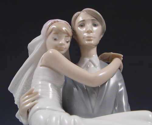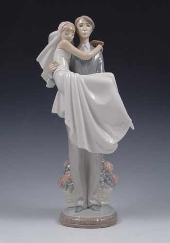 LLADRO OVER THE THRESHOLD WEDDING FIGURINE: Retired 2007. Bride and Groom with basket of flowers. Measures 10 1/4'' high.