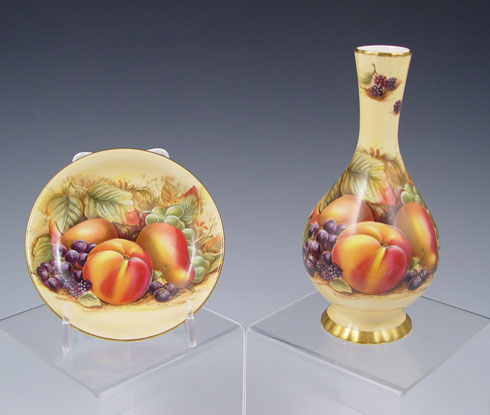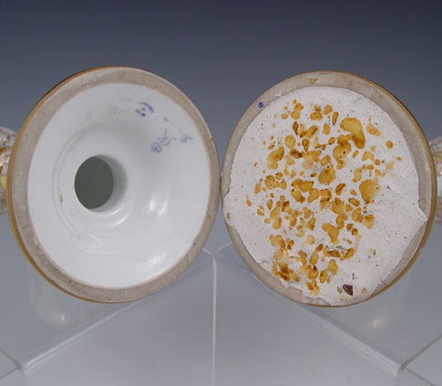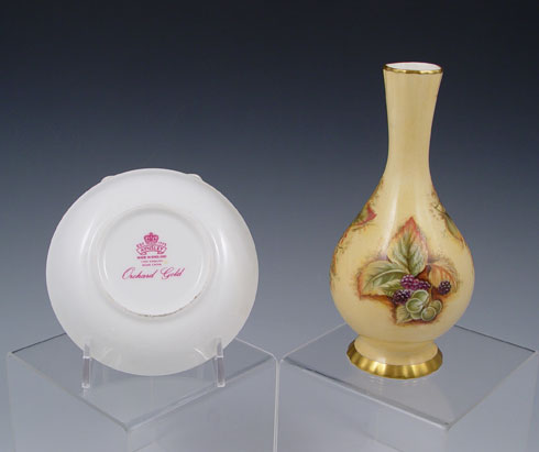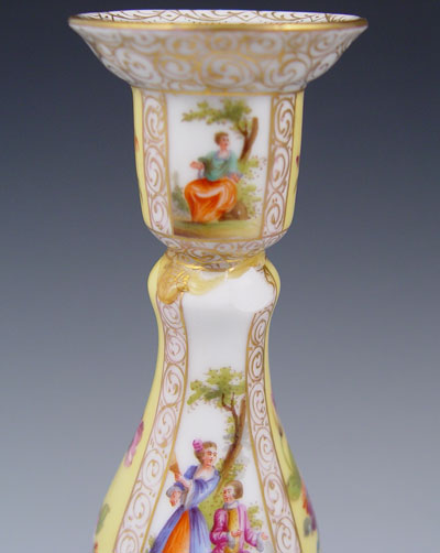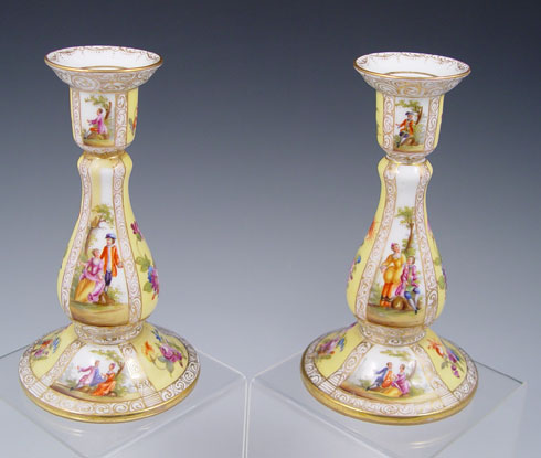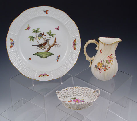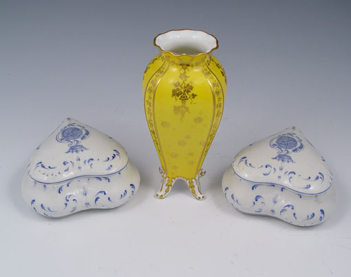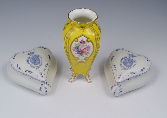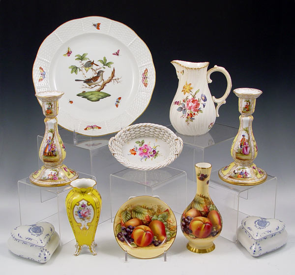 ESTATE PORCELAINS TO INCLUDE HEREND, DRESDEN, DERBY, SAARGEMUND: To include 1) 10'' Herend plate 2) Cross sword mark hand painted basket, 2'' x 5 1/2''. 3) Crown Derby yellow vase, very small chip, 5 1/4''. 4-5) Two Ginori covered heart dishes, 1 1/2'' x 4''. 6-7) Pair of Dresden candle sticks, 6 1/2'' tall, one with repair. 8-9) Ansley Orchard Gold Vase and pin tray 10) Saargemund hand painted pitcher, 5 3/4''h.