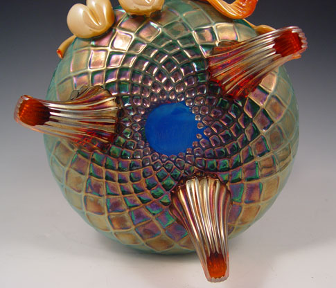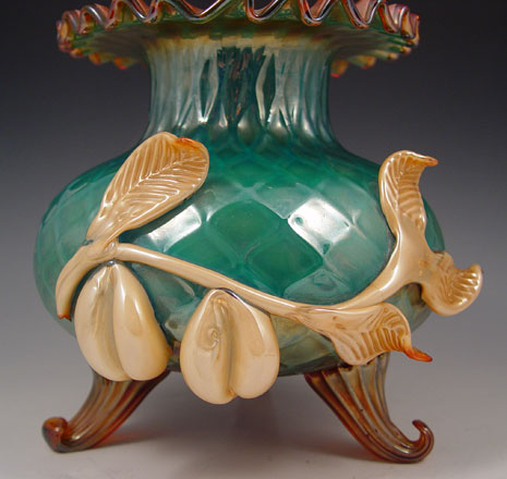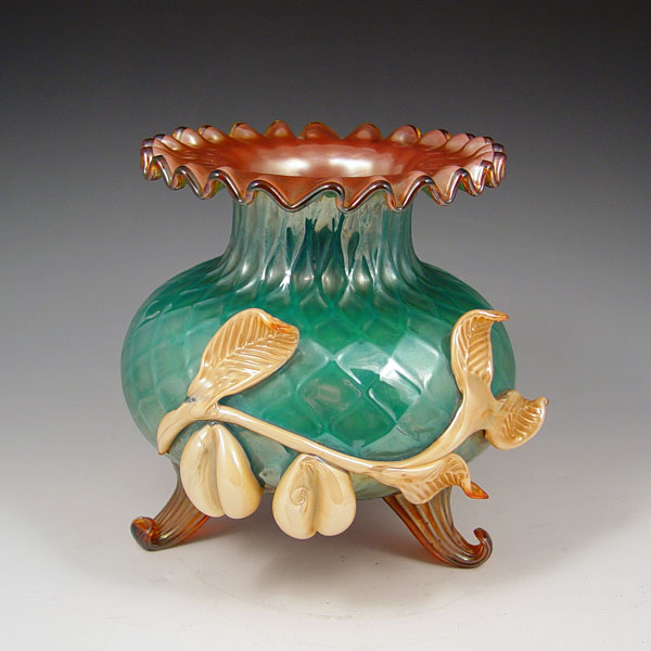 HUGE STEVENS & WILLIAMS IRIDESCENT ART GLASS VASE: Diamond quilted body with ruffle rim, applied fruit, leaves and scroll feet. 8''h. x 8'' dia. overall.