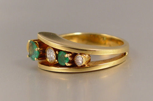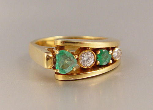 HEART SHAPED EMERALD AND DIAMOND RING: 18K yellow gold ring contains 2 heart shaped emeralds. Weight: .50 Ct. Approx. Rated VS in clarity (Type III), G in Hue, 3-5 in Tone and 3-4 in Saturation. Emeralds alternate with 2 round brilliant cut diamonds. Weight: .25 Ct. Approx. Rated VS in clarity and G-H in color. The emeralds are prong set. The diamonds are knife set. Weight: 10.6 grams. Size 7 Est. $850/1250**