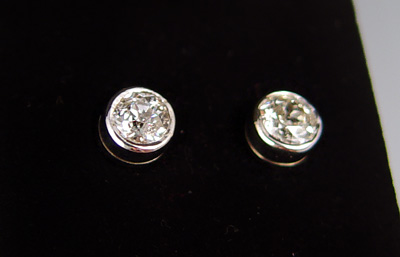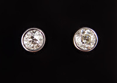 14K .88 CTW MINE CUT DIAMOND SOLITAIRE EARRINGS: 14K white gold earrings contain two old mine cut diamonds. Weight: .88 Ct. Approx. Rated SI2-I1 in clarity and I-J in color. The diamonds are bezel set. Post and nut closures. Weight: 1.4 grams.