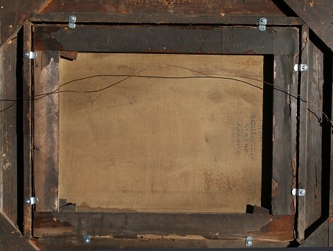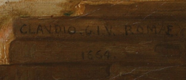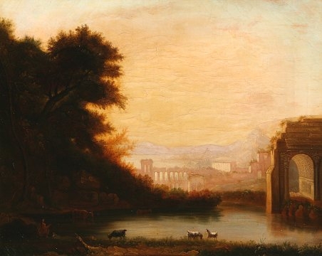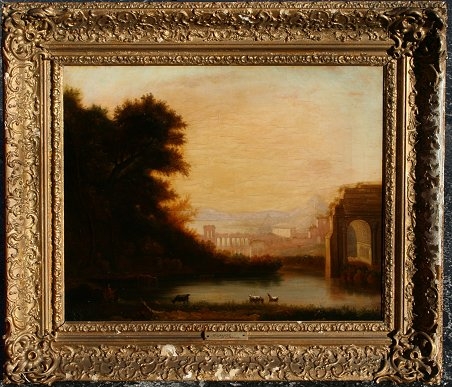 EARLY ITALIANATE LANDSCAPE PAINTING AFTER CLAUDE LORRAIN: OIL/C, 17'' x 21'', scene depicts cows and goats amongst the ruins at dusk, signed and dated 1554, encased in gilded gesso frame with wear and missing gesso, 24'' x 29''. Condition - No indication of re-line but evidence of scattered in-paint, needs cleaning.