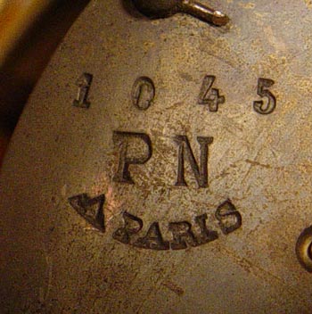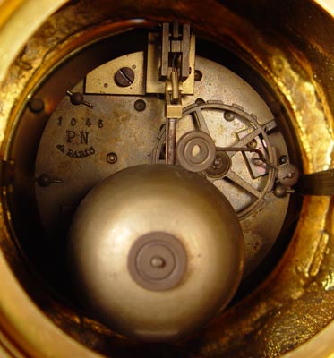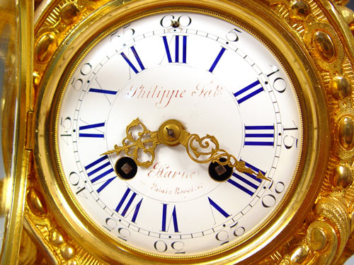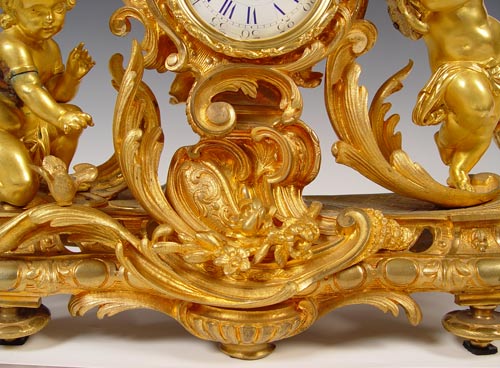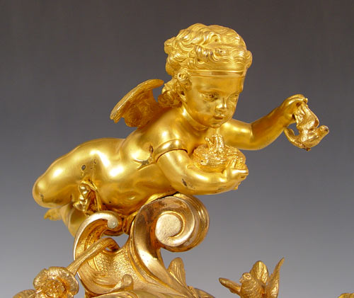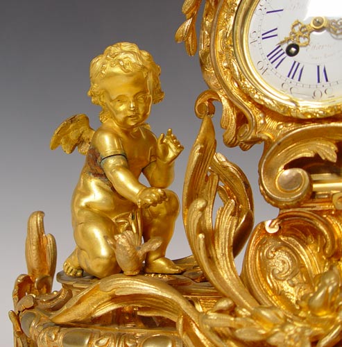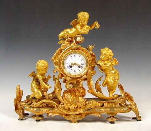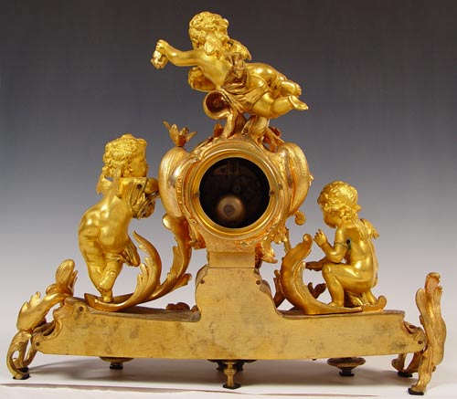 PHILIPPE FRENCH DORE' BRONZE CHERUB CLOCK: Circa 1830's featuring 3 cherubs, sweeping garland and bird decoration. Marked Philippe Fab't Palais Royal on enamel face. Please note area of repair on arm of one cherub, loss of gilt in isolated areas, improperly cleaned at some point in time affecting patina on cherubs. Marked PN Paris on mechanism. Measures 20 1/2'' high x 24 1/2'' wide x 6 1/2'' deep. No key, pendulum in office. Est. $6000/8000**
