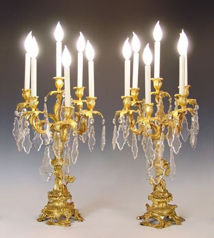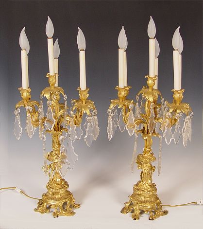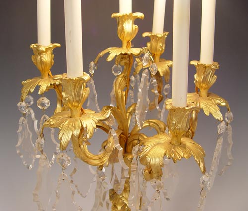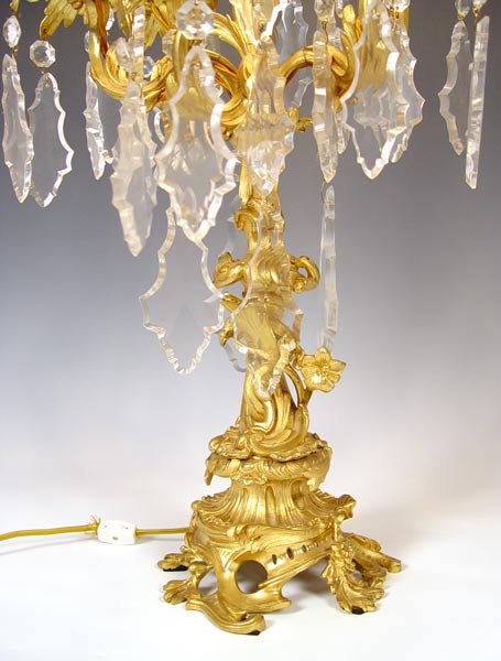 PR 19TH C FRENCH ROCOCO DORE BRONZE 6 LIGHT CANDELABRA LAMPS: CA. 1820 - 1830'S, scrolling floral motif arms festooned with large prisms, electrified, 23 1/2'' high, approx. 13'' x 14''.
