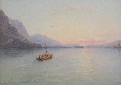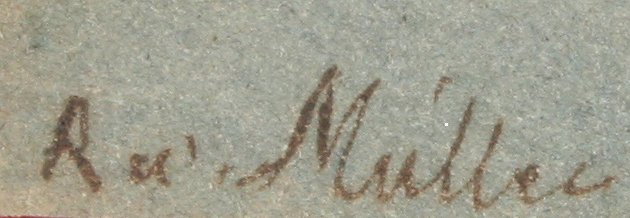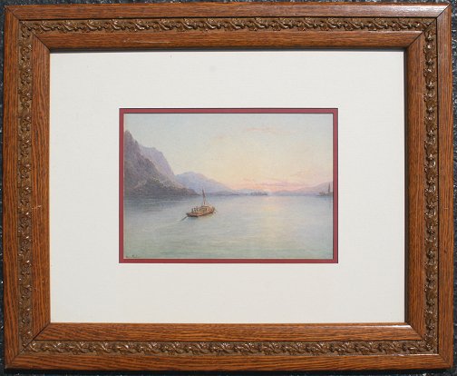 RUDOLF? MULLER RIVER TRAVELERS PAINTING: Watercolor, 7 1/2'' x 11'' sight size, signed lower left Ru. Muller, period carved oak frame, 11 1/2'' x 24''.