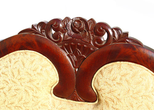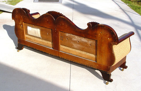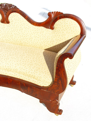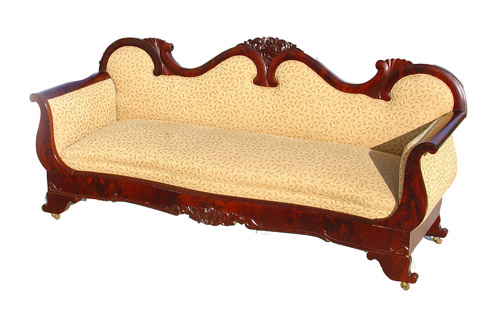 EMPIRE PERIOD VICTORIAN SOFA: Curved top rail, crotch grain mahogany veneers, serpentine skirt. Measures approx. 36 3/4'' high x 80'' x 21 1/2''